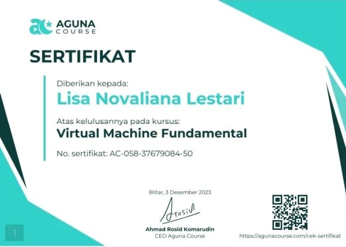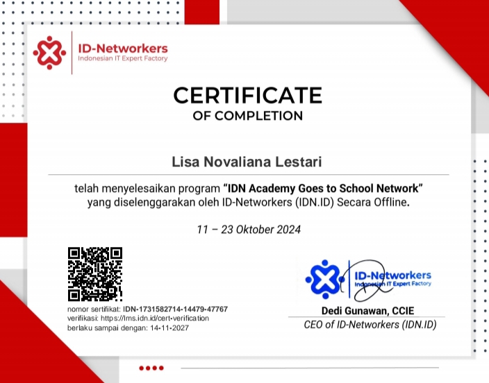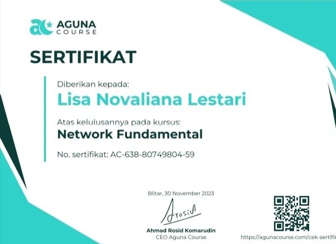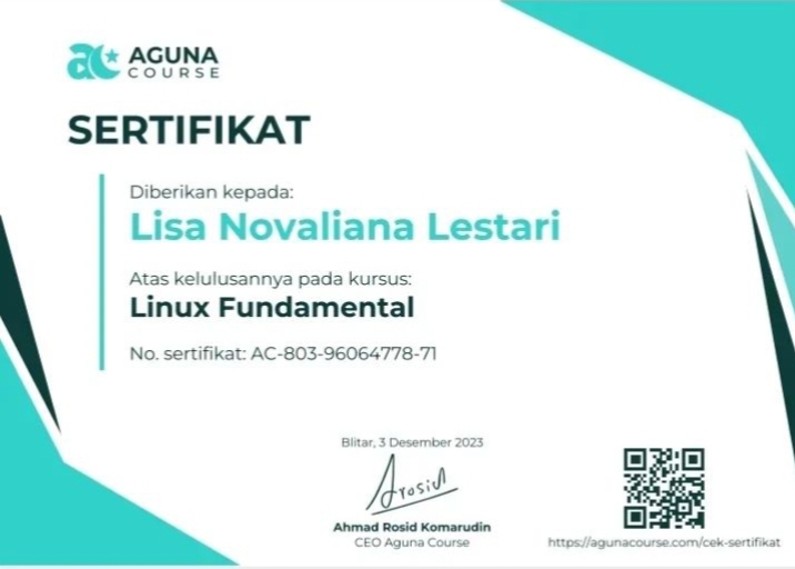 Perkenalkan, nama saya Lisa Novaliana Lestari. Saya pelajar SMK Negeri 1 Nglegok kelas XII jurusan Teknik Komputer dan Jaringan (TKJ). Saya tertarik pada jaringan komputer, Linux, dan pembuatan website sederhana. Saya senang belajar hal baru di bidang teknologi dan ingin terus mengembangkan kemampuan saya.